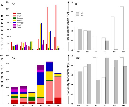 that subgroup participated is calculated from the total number of encounters. The raw data (Fig. 1A), reveal that the 2 control groups behaved according to our expectations. The wtb negative control shows a uniform distribution of aggressive encounters, whereas the beta-alanine positive control is skewed towards the mutants with high levels of beta-alanine (Fig. 1A1). The clearest effects among experimental groups were obtained from the octopamine mutants and the mb group. Both octopamine null mutants (oa-) and animals with inhibited mushroom bodies (mb-) are virtually non-aggressive (Fig. 1A). In the representation in Fig 1A2, the octopamine group seems similar to the wildtype control except for the missing values for 6aggr and 7aggr. However, while the oa+ animals appear to show a wildtype level of aggression, the mb+ animals show elevated levels of aggression compared to all other groups (Fig. 1A). It also appears that our serotonin treatment had little effect on aggression (Fig. 1A). The dopamine treatment appears to be somewhat effective in decreasing