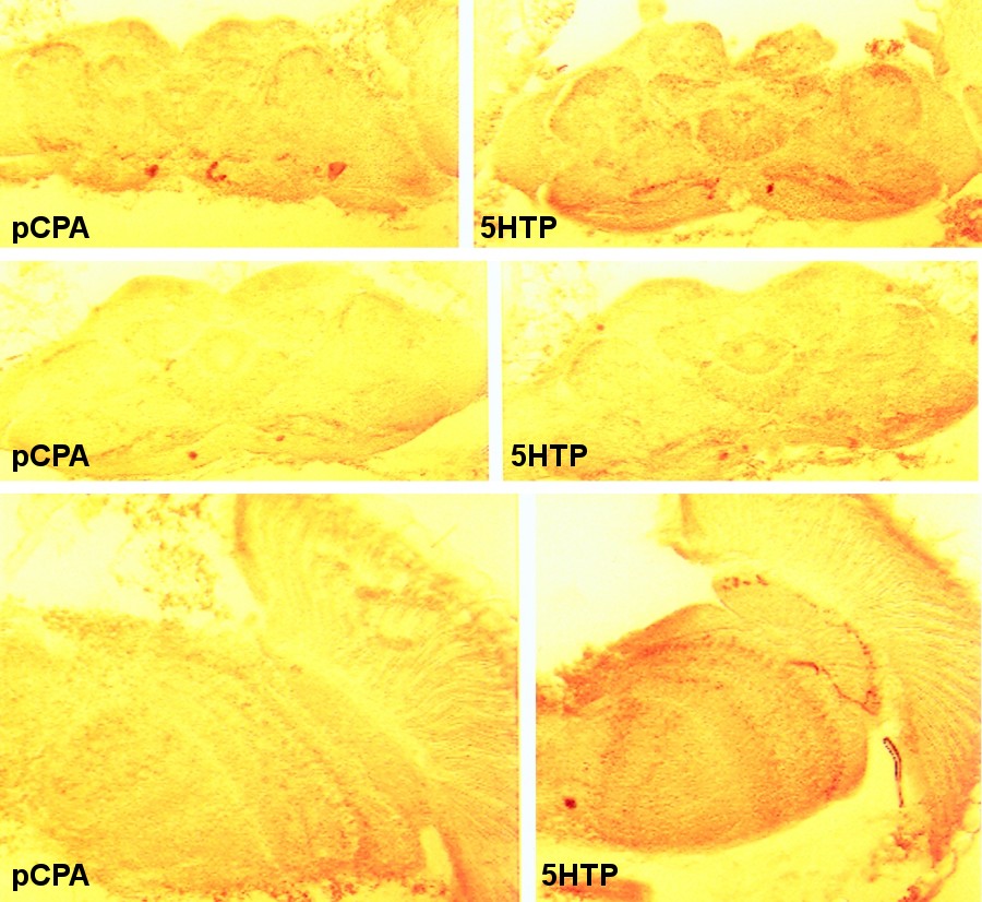 Mutants: Black1 and ebony1 mutant strains from the laboratory’s 18° C stock collection (provided by S. Benzer in 1970) were kept at 25° C for at least two generations. The M18 P-element octopamine mutant and control stocks (Monastirioti et al., 1996) were kept at 25° C for two generations after arrival. Transgenes: Sweeney et al. (1995) developed a method that constitutively blocks synaptic transmission by expressing the catalytic subunit of bacterial tetanus toxin (Cnt-E) in target neurons in the Drosophila brain using the P[GAL4] technique (Brand and Perrimon, 1993). Inspired by the preferential expression of certain dopamine and octopamine receptors in the mushroom bodies (Han et al., 1996, 1998), we used the Cnt-E transgene to block synaptic output from the mushroom bodies (Sweeney et al., 1995). Expression of another transgene, an inactive form of the tetanus toxin light chain (imp-tntQ), controlled for deleterious effects of protein overexpression (Sweeney et al., 1995). The P[GAL4] line mb247 (Schulz et al., 1996) served as a mushroom body specific GAL4 driver (Zars et al., 2000) for both toxins. The trans-heterozygote offspring from the GAL4 driver strain and the two UASGAL4 reporter strains (Cnt-E and imp-tntQ) entered the study. Pharmacological treatments: Drosophila from the wildtype strain Berlin (wtb) were treated as described by Neckameyer (1998) and Vaysse et al. (1988). Briefly, the animals were fed a sucrose solution containing either 10mg/ml of the serotonin precursor 5HTP (5-hydroxy-tryptophan), or 10mg/ml of the serotonin synthesis inhibitor pCPA (para-chlorophenylalanine) to manipulate serotonin levels. Effectiveness of the treatment was verified qualitatively with standard immunohistochemical techniques using rabbit serotonin antisera (see inset; Buchner et al., 1986, 1988). Alternatively, the animals were treated with 1mg/ml of the dopamine precursor L-DOPA (L-3,4-dihydroxyphenylalanine) or 10mg/ml of the dopamine synthesis inhibitor 3IY (3-iodo-tyrosine) to manipulate dopamine levels. Effectiveness of the treatment was verified by observation of cuticle tanning. A dose of 10mg/ml L-DOPA was lethal, confirming unpublished data from Wendy Neckameyer (Saint Louis University School of Medicine). Experimental groups: Using the different stocks described above, we arranged six different groups of ‘low’ vs. ‘high’ males, such that the respective amine or the amount of synaptic output from the mushroom bodies was manipulated to produce relative high and low level subgroups.