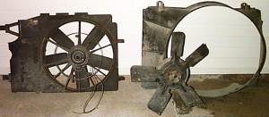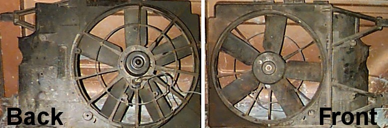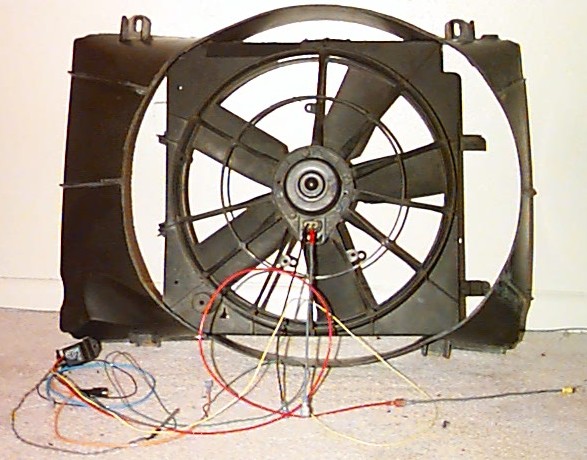 Click on images for larger pics! Parts: Electric fan from a 1995 Camaro 6 Cyl. (40$, wrecking yard). Hayden fan control unit with A/C wire and adjustable thermostat switch (36$, Autozone). Process: Removal of the old fan/clutch assembly was easy: simply unbolt the four