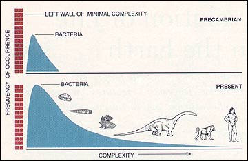 For reasons related to the chemistry of life's origin and the physics of self- organization, the first living things arose at the lower limit of life's conceivable, preservable complexity. Call this lower limit the "left wall" for an architecture of complexity. Since so little space exists between the left wall and life's initial bacterial mode in the fossil record, only one direction for future increment exists - toward greater complexity at the right. Thus, every once in a while, a more complex creature evolves and extends the range of life's diversity in the only available direction. In technical terms, the distribution of complexity becomes more strongly right skewed through these occasional additions. But the additions are rare and episodic. They do not even constitute an evolutionary series but form a motley sequence of distantly related taxa, usually depicted as eukaryotic cell, jellyfish, trilobite, nautiloid, eurypterid (a large relative of horseshoe crabs), fish, an amphibian such as Eryops, a dinosaur, a mammal and a human being. This sequence cannot be construed as the major thrust or trend of life's history. Think rather of an occasional creature tumbling into the empty right region of complexity's space. Throughout this entire time, the bacterial mode has grown in height and remained constant in position. Bacteria represent the great success story of life's pathway. They occupy a wider domain of environments and span a broader range of biochemistries than any other group. They are adaptable, indestructible and astoundingly diverse. We cannot even imagine how anthropogenic intervention might threaten their extinction, although we worry about our impact on nearly every other form of life. The number of Escherichia coli cells in the gut of each human being exceeds the number of humans that has ever lived on this planet. One might grant that complexification for life as a whole represents a pseudo-trend based on constraint at the left wall but still hold that evolution within particular groups differentially favors complexity when the founding lineage begins far enough from the left wall to permit movement in both directions. Empirical tests of this interesting hypothesis are just beginning (as concern for the subject mounts among paleontologists), and we do not yet have enough cases to advance a generality. But the first two studies - by Daniel W. McShea of the University of Michigan on mammalian vertebrae and by George F. Boyajian of the University of Pennsylvania on ammonite suture lines - show no evolutionary tendencies to favor increased complexity. Moreover, when we consider that for each mode of life involving greater complexity, there probably exists an equally advantageous style based on greater simplicity of form (as often found in parasites, for example), then preferential evolution toward complexity seems unlikely a priori. Our impression that life evolves toward greater complexity is probably only a bias inspired by parochial focus on ourselves, and consequent overattention to complexifying creatures, while we ignore just as many lineages adapting equally well by becoming simpler in form. The morphologically degenerate parasite, safe within its host, has just as much prospect for evolutionary success as its gorgeously elaborate relative coping with the slings and arrows of outrageous fortune in a tough external world. Even if complexity is only a drift away from a constraining left wall, we might view trends in this direction as more predictable and characteristic of life's pathway as a whole if increments of complexity accrued in a persistent and gradually accumulating manner through time. But nothing about life's history is more peculiar with respect to this common (and false) expectation than the actual pattern of extended stability and rapid episodic movement, as revealed by the fossil record. Life remained almost exclusively unicellular for the first five sixths of its history - from the first recorded fossils at 3.5 billion years to the first well- documented multicellular animals less than 600 million years ago. (Some simple multicellular algae evolved more than a billion years ago, but these organisms belong to the plant kingdom and have no genealogical connection with animals.) This long period of unicellular life does include, to be sure, the vitally important transition from simple prokaryotic cells without organelles to eukaryotic cells with nuclei, mitochondria and other complexities of intracellular architecture - but no recorded attainment of multicellular animal organization for a full three billion years. If complexity is such a good thing, and multicellularity represents its initial phase in our usual view, then life certainly took its time in making this crucial step. Such delays speak strongly against general progress as the major theme of life's history, even if they can be plausibly explained by lack of sufficient atmospheric oxygen for most of Precambrian time or by failure of unicellular life to achieve some structural threshold acting as a prerequisite to multicellularity. More curiously, all major stages in organizing animal life's multicellular architecture then occurred in a short period beginning less than 600 million years ago and ending by about 530 million years ago - and the steps within this sequence are also discontinuous and episodic, not gradually accumulative. The first fauna, called Ediacaran to honor the Australian locality of its initial discovery but now known from rocks on all continents, consists of highly flattened fronds, sheets and circlets composed of numerous slender segments quilted together. The nature of the Ediacaran fauna is now a subject of intense discussion. These creatures do not seem to be simple precursors of later forms. They may constitute a separate and failed experiment in animal life, or they may represent a full range of diploblastic (two-layered) organization, of which the modern phylum Cnidaria (co