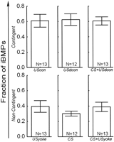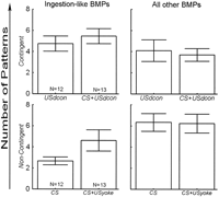 1975 BMP Analysis In order to assess the effects of the different treatments on the buccal Central Pattern Generator, three levels of analysis were used. First, we analyzed the total number of BMPs, irrespective of BMP-type. To gather more detailed information, we then analyzed the fraction of BMPs that were ingestion-like in nature (i.e., iBMPs). This measure has the advantage in that it describes the propensity of a preparation to produce iBMPs, irrespective of the total number of patterns produced. Finally, we evaluated the absolute number of iBMPs versus all other BMPs, to gain insight into the absolute changes in the generation of BMPs. A one-way ANOVA (see Materials and Methods) over the total number of BMPs in all six groups did not reveal any significant variations in the total number of BMPs produced, neither in the pretest period immediately preceding the training (SS = 41.5, DF = 5, MS = 8.3, F = 0.48, p = 0.8), nor in the test immediately after the training (SS = 38.1, DF = 5, MS = 7.6, F = 0.38, p = 0.9). Thus, groups did not differ in their propensity to produce BMPs, before or after the training (i.e., treatment did not have any effect on the total number of all BMPs produced by the preparations). Next, the fraction of iBMPs was evaluated. A one-way ANOVA over the six groups in the pretest period immediately preceding the training, was not significant (SS = 0.18; DF = 5; MS = 0.036; F = 0.74; p = 0.6). Thus, the six different groups did not differ significantly in the fraction of iBMPs produced before the training. This result indicates that all preparations had the same propensity to produce ingestion-like BMPs and any difference after training can only be attributed to the parameters of the stimulations during training. All Contingently Reinforced Groups Increased the Propensity to Produce iBMPs A one way ANOVA over the fraction of iBMPs in the six groups in the five minutes immediately following training, was significant (SS = 1.26; DF = 5; MS = 0.25; F = 4.5; p = 0.001). Fisher LSD post-hoc tests reveal that this significance was due to only the contingently reinforced groups differing from all noncontingent groups (Table 1). Thus, none of the different variations in US timing and duration had any effect on the magnitude of learning: contingently reinforced (via stimulation of En2) preparations produced on average a larger fraction of iBMPs than preparations that received either no US at all or noncontingent USs, irrespective of the US parameters (Fig. 3).