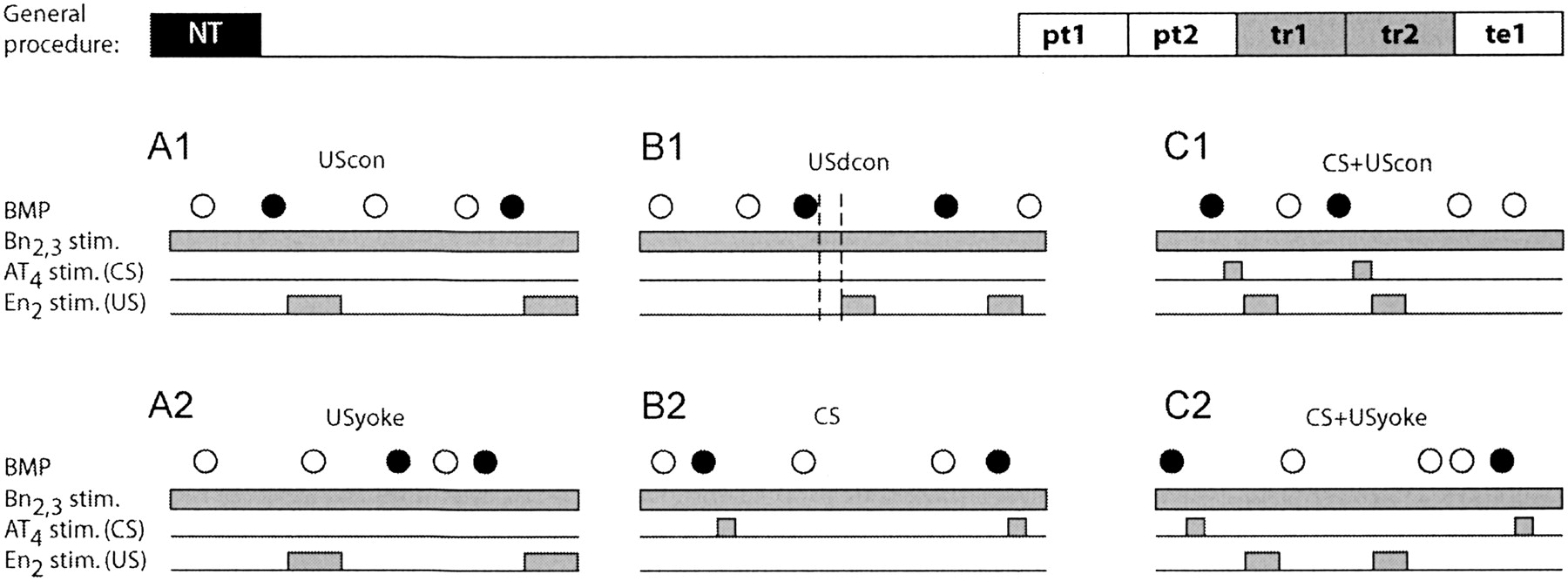 1997 The respective second groups (Fig. 2B) were designed to test the effect of a delay and shortening of the reinforcing stimulus (US), as well as the effect of adding a contingent CS without a US. The contingently reinforced group (USdcon, Fig. 2B1) received a contingent US as the "UScon" group. But compared to the UScon group, the US was shortened from 6 to 4 sec and delayed by 2 sec (USdcon, Fig. 2B1). The other group (CS, Fig. 2B2) received only contingent CS presentations and no US presentations. This group was included to control for possible effects of contingent CSs alone (Fig. 2B2). The expected outcome was an elevated number of iBMPs in the USdcon group versus any of the noncontingent groups, and an unaffected number of BMPs in the group that only received a CS, compared to the other two noncontingent groups (i.e., Figs. 2A2, 1C2). Potentially, the USdcon group could have shown a lower number of BMPs than either the UScon (Fig. 2A1) or the CS+USdcon (Fig. 2C1) group. The respective last groups in each triplet (Fig. 2C) were designed to investigate the effect of combining the shortened and delayed US with a contingent CS to "signal" the occurrence of the US (Fig. 2C). Both groups received contingent CS presentations after every iBMP, throughout the experiment. The contingently reinforced group (CS+USdcon) received contingent US presentations after each iBMP/CS combination (Fig. 2C1), whereas the control group (CS+USyoke) received the same sequence of US presentations as the contingently reinforced group, but independent of its behavior (yoked control; Fig. 2C2). In an intact Aplysia, the protocol of CS+USdcon would be analogous to a bite (iBMP) leading to a tactile stimulation of the lips (AT4 stimulation) followed by food (En2 stimulation).