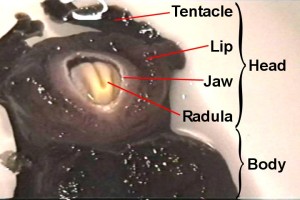 the jaws, followed by the protraction of the radula (cream colored
