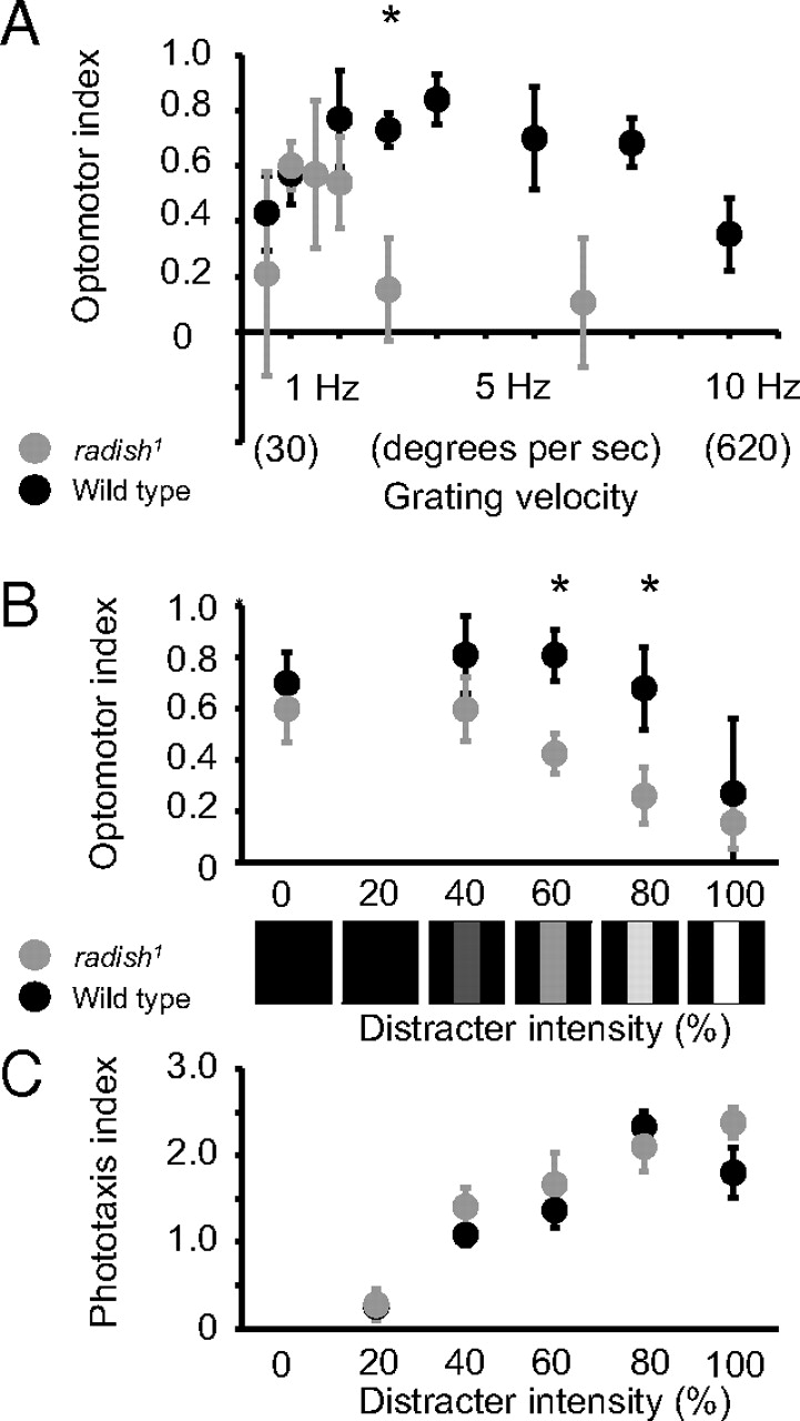 Radish mutants are not blind and respond to visual stimuli, as has been shown in other behavioral studies (Gong et al., 1998). Phototaxis appears to be normal in radish mutants when tested in response to a light source in our maze paradigm (OI = 2.4 ± 0.15 vs OI = 2.55 ± 0.08 for wild type). To fully explore whether radish1 responds at all to moving gratings, we exposed the mutants to different grating velocities. Wild-type flies typically display a velocity curve with decreased responsiveness at very low (<1 Hz) or very high (>10 Hz) grating velocities (Fig. 2A). We were surprised to find that radish mutants displayed a shifted velocity curve compared with wild type, with peak responsiveness at low (∼1 Hz) grating velocities but no response at 3 Hz (Fig. 2A), which is the grating velocity we used in our initial behavioral characterization (above). Although this shifted optomotor effect in radish1 requires additional explanation, the fact that radish1 does respond to slower moving gratings allowed us to test the mutant for distraction phenotypes.