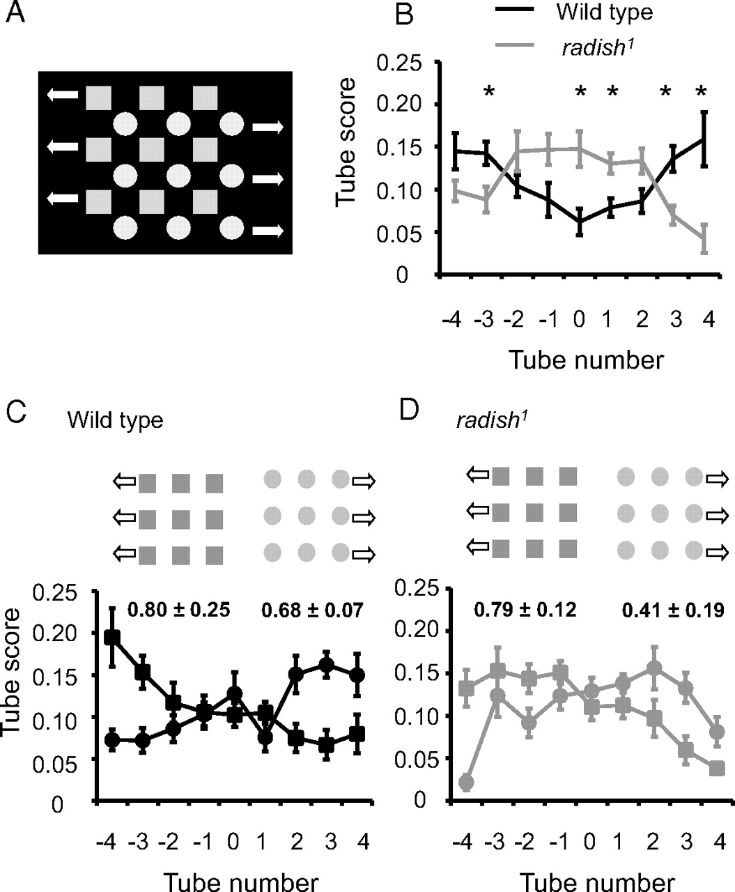 The fruit fly Drosophila melanogaster has been used for >30 years as a model system to study behavior in general (Vosshall, 2007) and learning and memory specifically (Keene and Waddell, 2007). More recently, investigations relating memory defects to attention-like processes have been initiated (van Swinderen, 2005, 2007; van Swinderen et al., 2009). Numerous Drosophila mutants defective in various aspects of memory formation represent a promising starting point to study the interactions between attention-like processes, memory, and action selection. For instance, a mutant might fail to show learning because it might not attend appropriately to relevant stimuli during memory formation, consolidation, or retrieval. Attention-like processes can be measured by the suppression of a competing stimulus, and such suppression effects should display quantifiable alternation dynamics that are reflected in the ongoing behavior of an animal. To provide insight into attention in animals, one approach is to measure short-term behavioral processes during perceptual tasks. However, short-term processes are rarely characterized in Drosophila learning mutants, for example, in which often a single population performance index may conceal informative defects in attention-like behavior. As a case in point, recent work has shown that the learning mutants dunce1 and rutabaga2080 appear to be less distracted by competing visual stimuli compared with wild-type flies, in both behavioral and electrophysiological paradigms (van Swinderen, 2007). Using a recently developed optomotor maze (van Swinderen and Flores, 2007), in which walking flies make successive turn choices in response to visual underlying moving gratings, dunce and rutabaga mutants were also found to display significantly greater optomotor responses in the maze than did wild-type flies, leading to the hypothesis that higher optomotor scores predict defective suppression mechanisms characteristic of attention (van Swinderen, 2007). Interestingly, the Drosophila radish1 mutation did not show a significant optomotor response in the maze under the same conditions that produced strong responses in dunce1 and rutabaga2080.