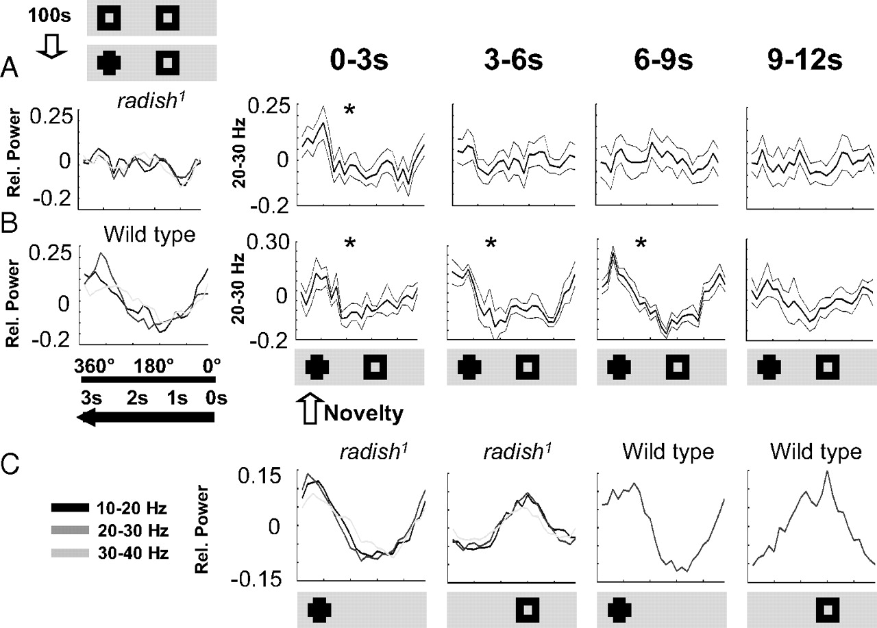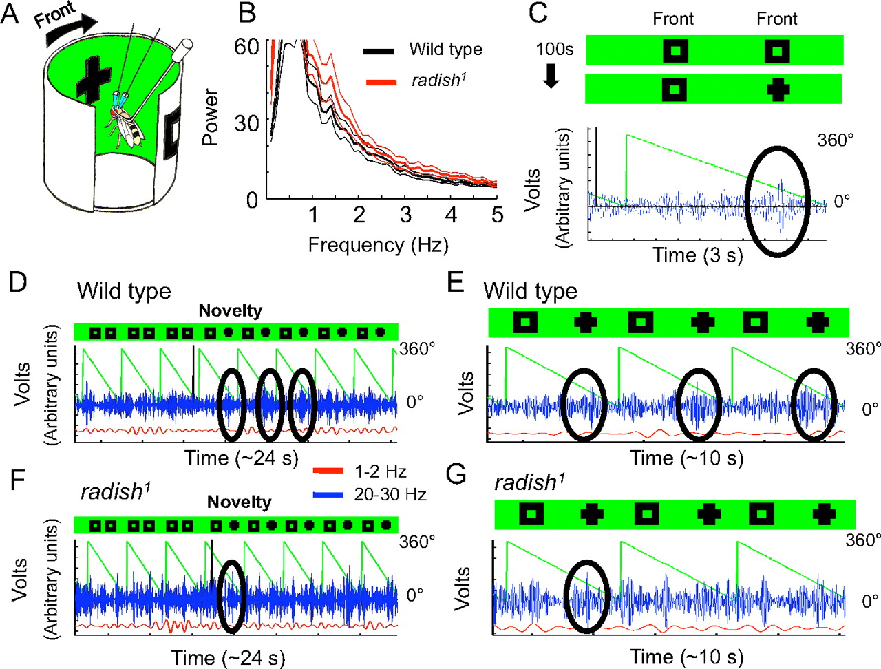 A more general explanation for the behavioral defects described so far for radish1 would suggest that these mutants have an “attention deficit.” To address attention-like processes in the brain of radish mutants, we recorded LFPs while presenting competing visual stimuli of variable salience. As described above, introducing competing visual objects to radish mutants in tethered flight resulted in a dramatically increased 1–2 Hz torque behavior, indicating that radish mutants are responding to the competing visuals by engaging in this strongly periodic behavior. Because the net consequence of this behavior is decreased time fixating either object (discussed above), this suggested an increased rate of perceptual alternations in radish mutants. We therefore proceeded to investigate brain responses to competing visual stimuli. Brain LFP activity in the 20–30 Hz range was shown previously to be associated with visual salience effects such as novelty, with wild-type flies showing a significant selection of visual novelty and simultaneous suppression of a competing non-novel object (van Swinderen and Greenspan, 2003; van Swinderen, 2007; van Swinderen et al., 2009). The learning and memory mutants dunce1 and rutabaga2080 are defective in their brain responses to visual novelty, and this is associated with increased optomotor behavior in the maze (van Swinderen, 2007). We probed whether brain LFP responses were also compromised in radish mutants because radish1 performed poorly in the optomotor maze, were more distractible, and attended more briefly to visual stimuli in tethered flight relative to wild type.