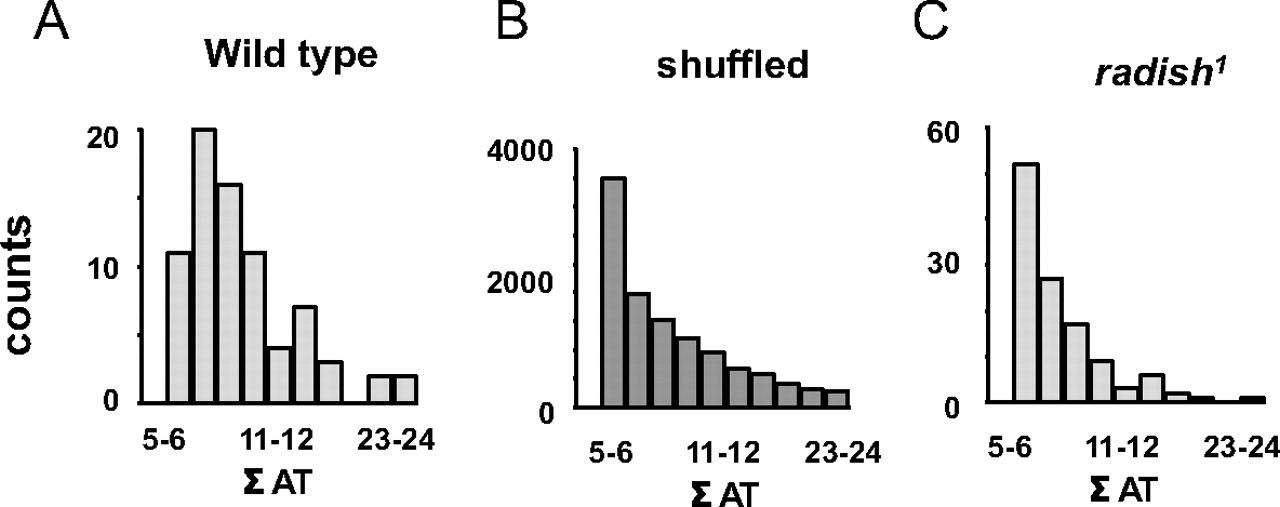 Wild-type flies and radish mutants were exposed to two objects in open loop (a square and a cross) simultaneously, as before (Fig. 5), but for extended epochs (400–800 s per fly) (Fig. 7). For each recording, 20–30 Hz power was summed for the consecutive 1.5 s periods when either object was in the frontal hemifield of the fly (Fig. 7A, black and gray bars). Thus, for every full 3 s rotation of the panorama, two 20–30 Hz values were calculated, one for either object. The log ratios of these two 20–30 Hz values are plotted for a sample wild-type fly in Figure 7B, for 60 successive cycles of the panorama rotation. The 20–30 Hz activity often appeared to alternate in power between objects: when power for one object was high, it was then low for the other object during that cycle (Fig. 7B). At times (or in the special case of salience relating to novelty, as above) such partitioning of 20–30 Hz power was biased toward one object for several successive cycles before alternating. Timings (in rotation cycles) between such alternations, termed here as AT (alteration time), were tallied (Fig. 7B, gray and black numbers) and visualized by a histogram (Fig. 7C, for the same sample fly). Noticing that wild-type AT data looked “clumped” (i.e., epochs when 20–30 Hz was biased to one or the other object for successive cycles; there are 5 such clumps in Fig. 7C) (supplemental Methods, available at www.jneurosci.org as supplemental material), we quantified this LFP bias (labeled Σ AT) in the fly brain activity by summing the duration (in total rotation cycles) of each AT clump (Fig. 7C, corresponding numbers in the right column). Combined data from eight wild-type flies revealed a frequency histogram with a characteristic shape resembling a gamma distribution (Fig. 8A).