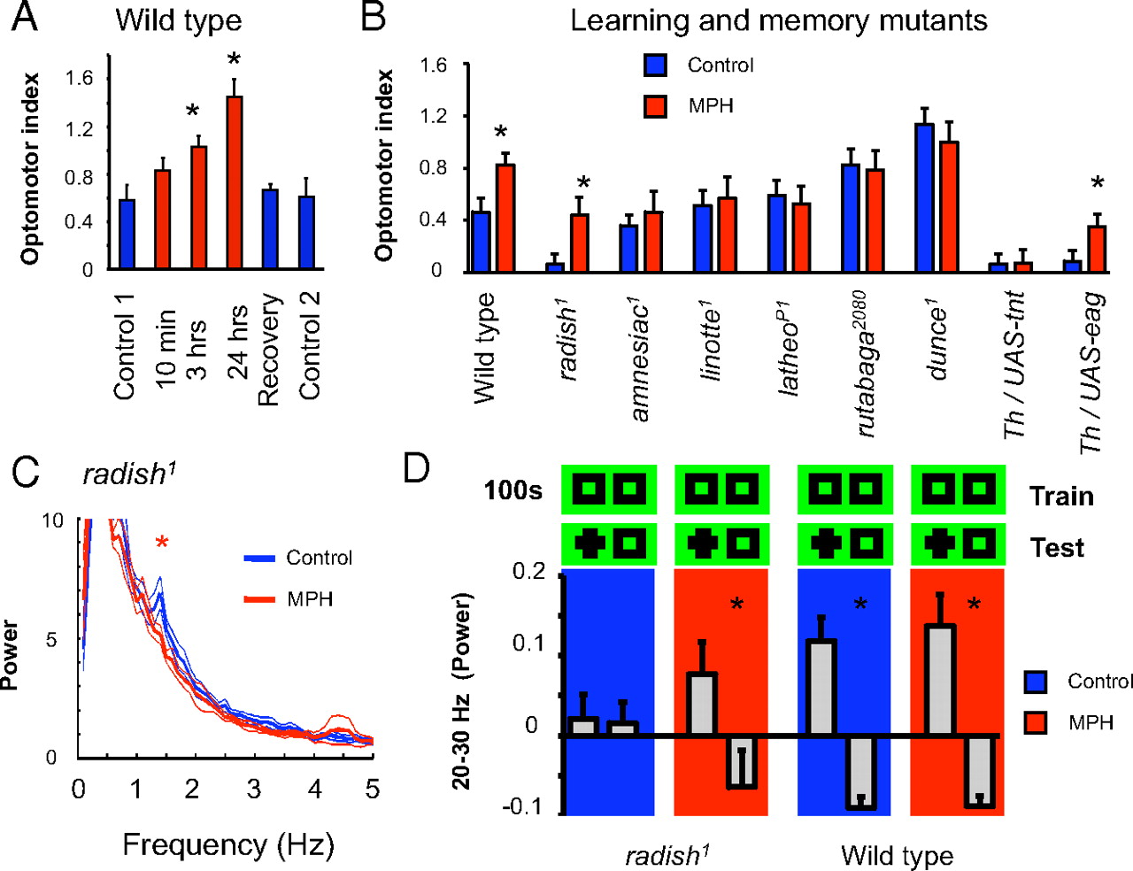 The most intriguing open question following from our results is how the divergent attention-like effects in the classical learning mutants can be related to their converging memory defects. Of course, there may not be a connection at all. The common learning phenotype is restricted to classical olfactory learning; in visual learning, radish1 appears to perform reasonably well, whereas dunce and rutabaga mutants fail (Gong et al., 1998; Brembs and Plendl, 2008). Moreover, the olfactory memory phenotypes of these mutants are rescued acutely (McGuire et al., 2003; Folkers et al., 2006), whereas the short-term defects described here and elsewhere (van Swinderen, 2007; van Swinderen et al., 2009) can only be rescued by expressing the wild-type gene during development and not in the adult. Surprisingly, our MPH results suggest that some of these short-term deficiencies (most likely caused by developmental defects in the brain) can be acutely compensated via alternate pathways modulating dopamine function.