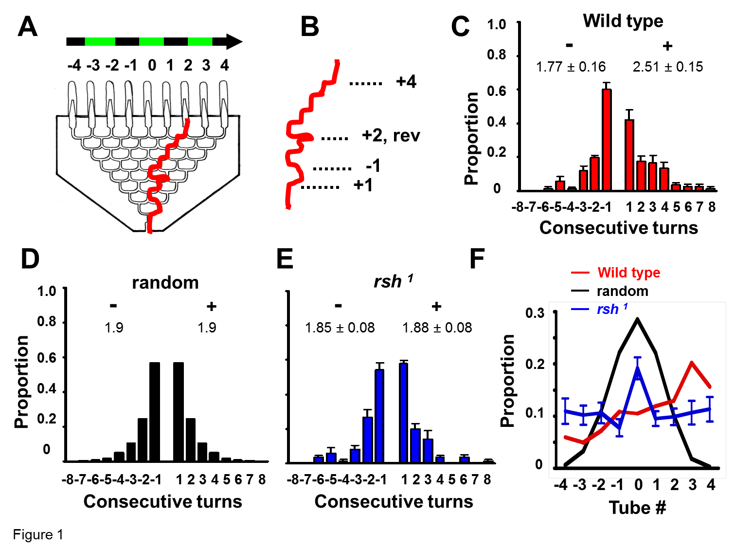The number of consecutive turns in the same direction, before turning to the alternate direction or reversing, was tallied per fly as well, yielding a choice persistence index. Each fly could make a number of consecutive turns in either direction, up to a maximum of eight consecutive turns (which would necessarily position it in tubes −4 or +4). These data were summed for 10 flies per maze (40 in total) and averaged for a genotype. A weighted average of these eight possible categories was calculated for either direction (total 1 turn * 1 + total 2 turns * 2 +…+ total 8 turns*8), yielding a measure of choice persistence, which was normalized by the total number of turns. Perfect alternation behavior would thus yield a score of 1, random behavior would yield a score of 1.9 [based on a random model produced in MATLAB (MathWorks); data not shown], and significantly greater persistence scores indicate consistent turns in the same direction (stereotypy). In all of our individual fly analyses, we only quantified the behavior of the first 10 flies to complete each maze run.