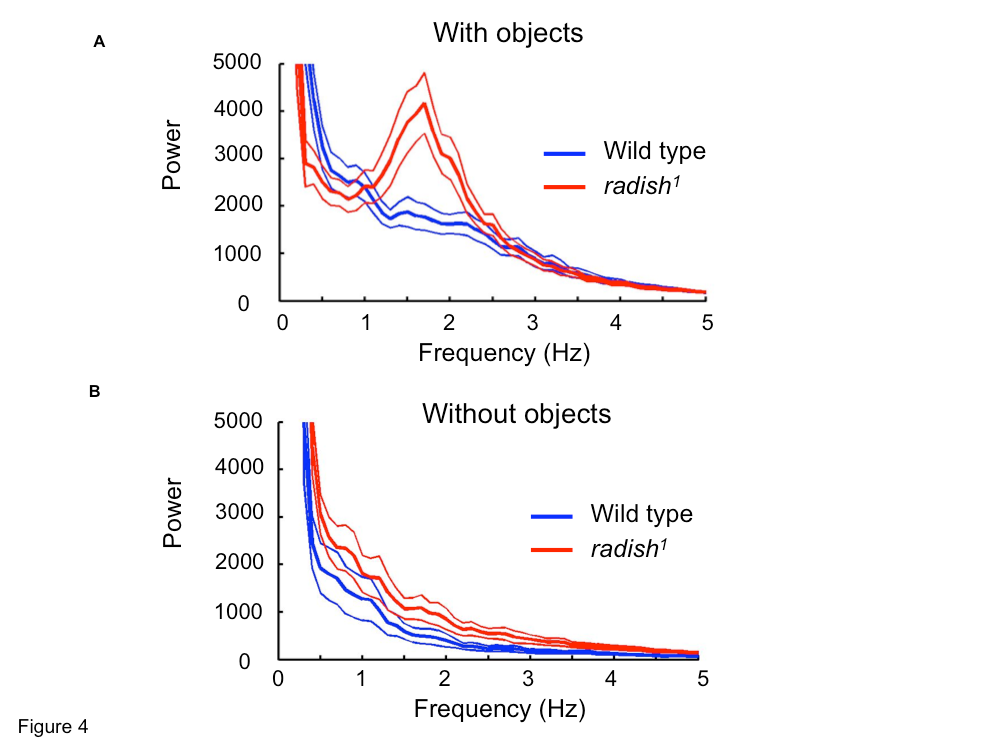 We found that radish mutants are defective for a number of short-term processes relevant to selective attention. These include the following: altered optomotor responsiveness, reduced turn stereotypy, and increased distraction in a visual choice maze; periodic hyperactivity and reduced fixation time in the tethered flight arena; and less sustained response dynamics as measured by local field potential (LFP) recordings in the brain.