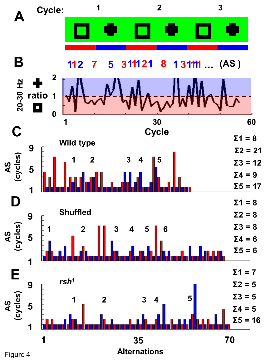 Finally, we applied the same methodology to radish1 and found that these mutants displayed brain LFP alternation statistics that were not significantly different from shuffled wild-type data (Figs. 7E, 8C) (p = 0.85 by the Kolmogorov–Smirnov test for distributions). This suggests that radish1 brain activity is alternating randomly between the two visual percepts (the cross and the square), without the sustained “attention” across successive cycles characteristic of wild-type flies. Curiously, heat-shock of hs–rsh(161) failed to rescue this alternation defect in radish mutants but did result in improved novelty detection (supplemental Fig. 5, available at www.jneurosci.org as supplemental material).